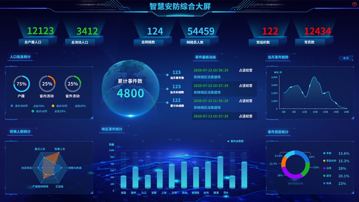 全方位立體式還原院區實貌,分圖層對院區的區域、建筑、單位、安防設備、管理設備、警情等進行查看、監控和跟蹤;通過院區各類安防管理設備實時獲取各重點監控區域的監控數據,對各種突發事件進行報警。通過人臉識別、車牌識別、行為識別、武器管理、營區設備等各類傳感器,對人、車、物及其行為的全面感知,保障營區安全。 -